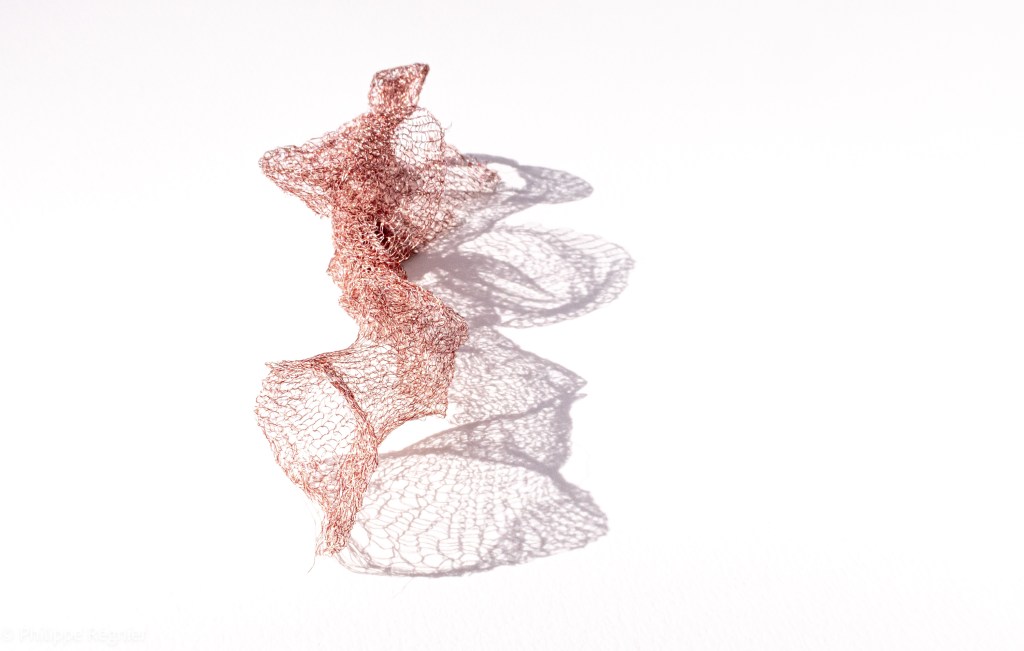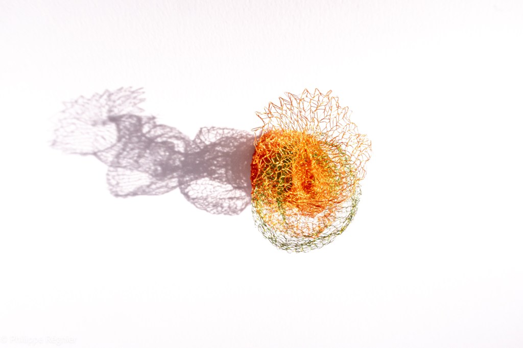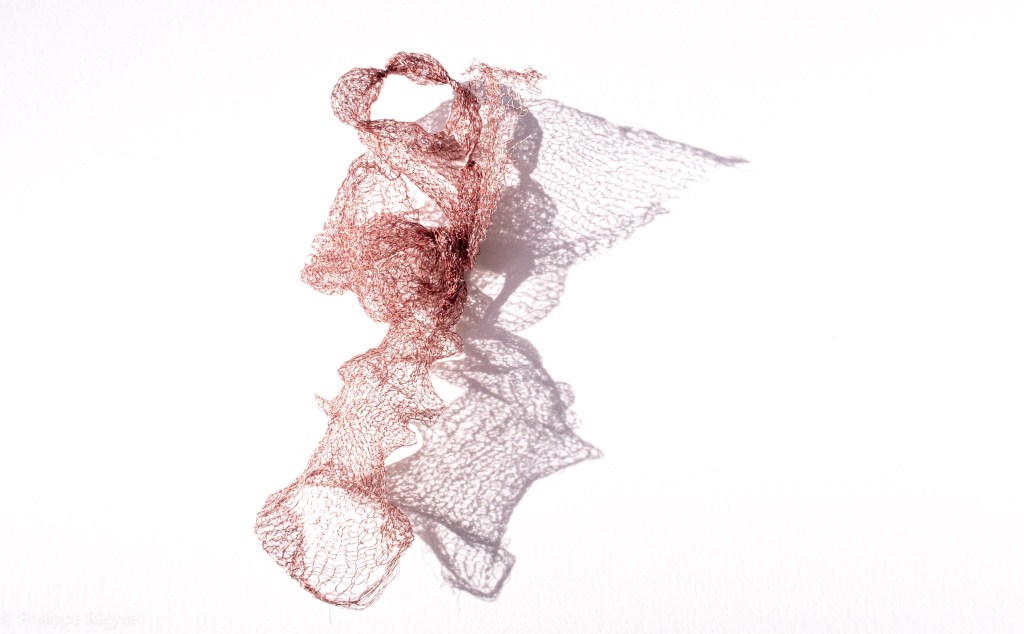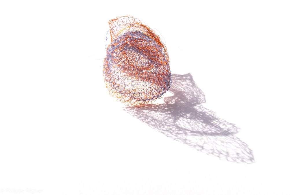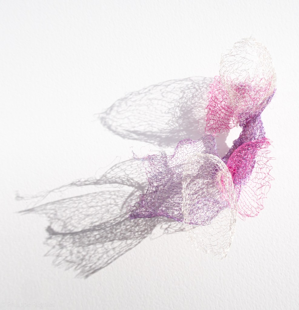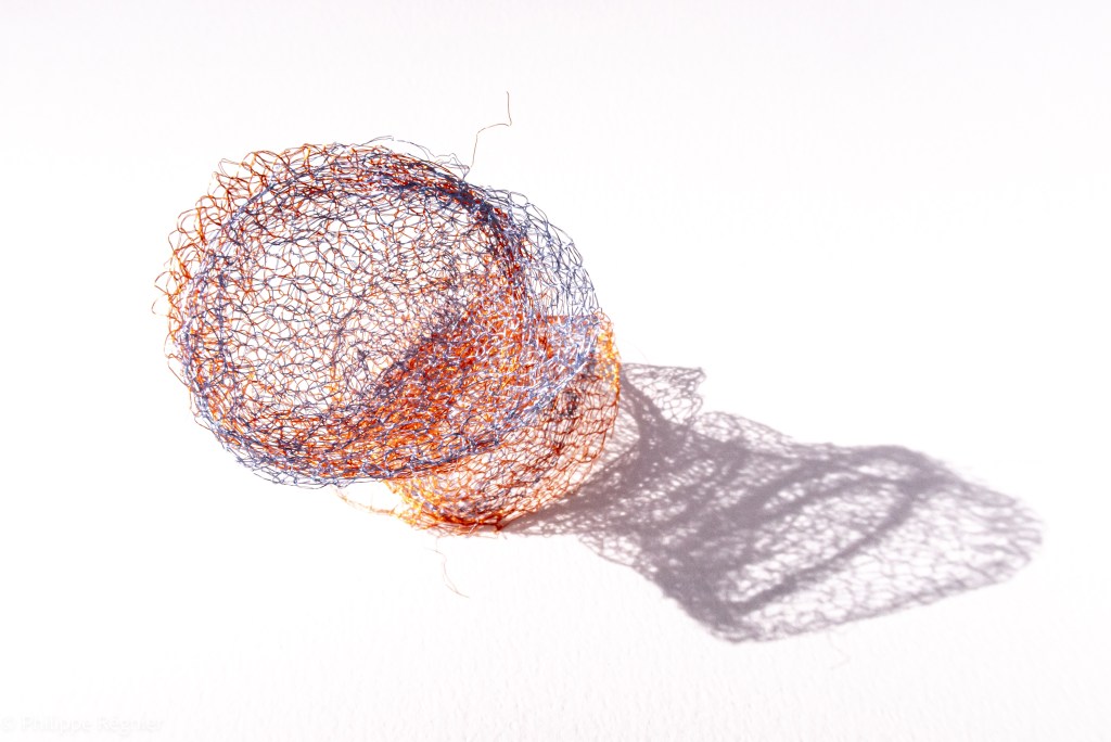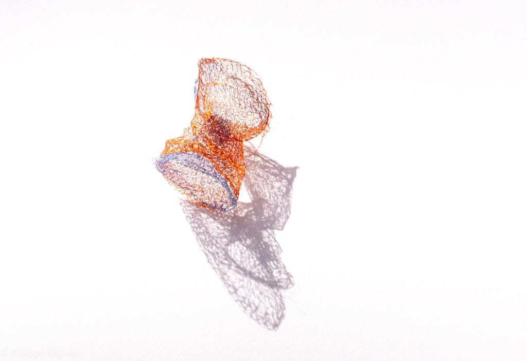 Que représente Microorganisme 2054, série ouverte débutée pour le concours international 2025 « Tisser le futur » des mini-textiles du Musée de la tapisserie contemporaine d’Angers? A l’origine de la Vie, les micro-organismes sont aussi les gardiens de notre futur. La technique intuitive que j’ai développée convoque, par analogie, plusieurs facettes des micro-organismes : petites dimensions, extrême légèreté, oeuvre en un fil et transparence. Cette dernière qualité offre une variété infinie d’ombres portées, métaphore pour célébrer leur incroyable potentiel.
