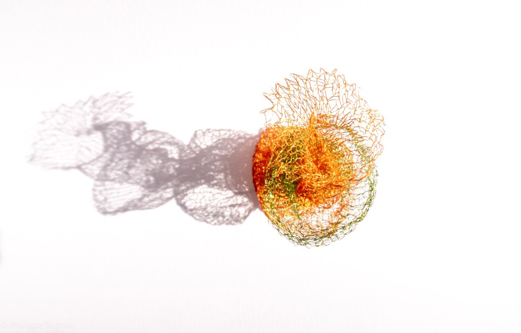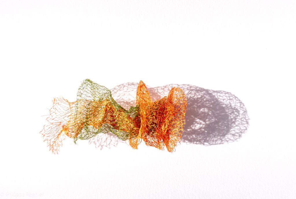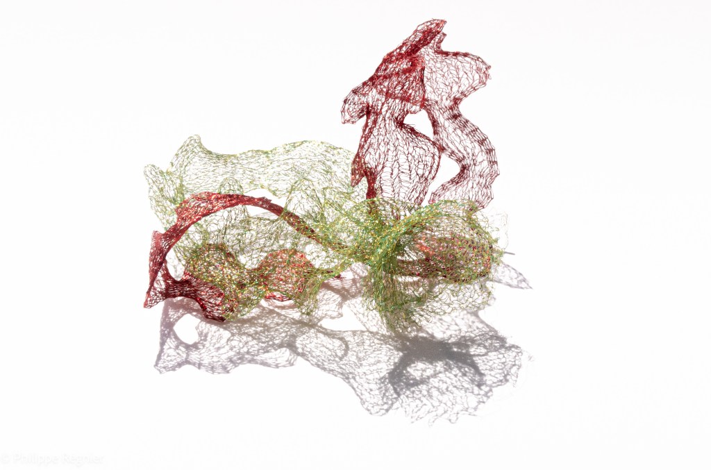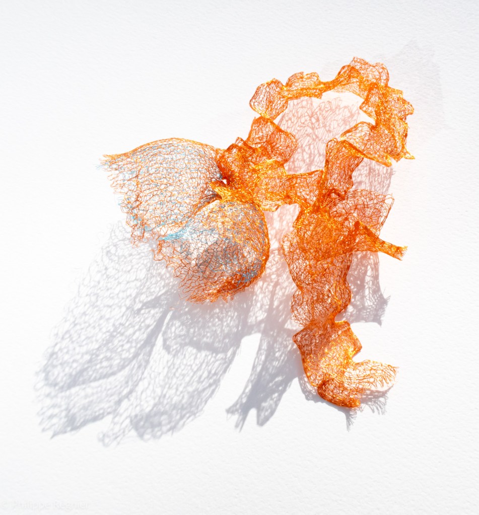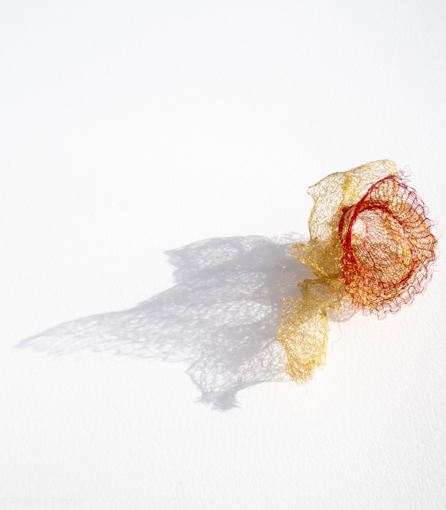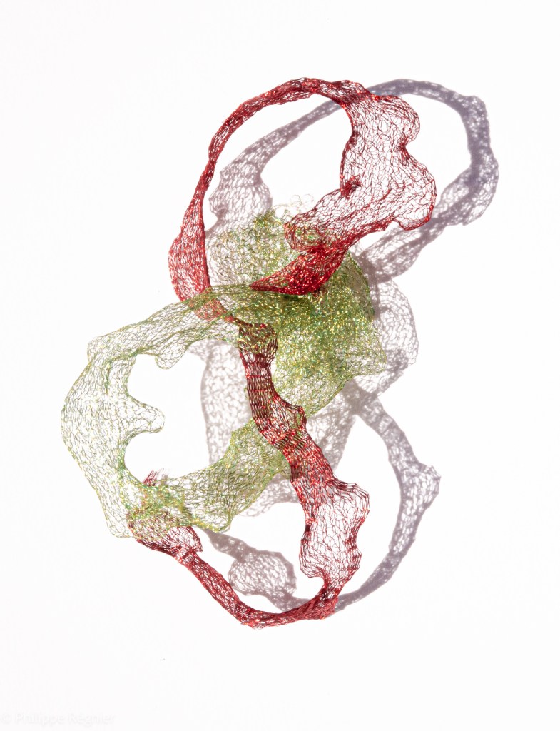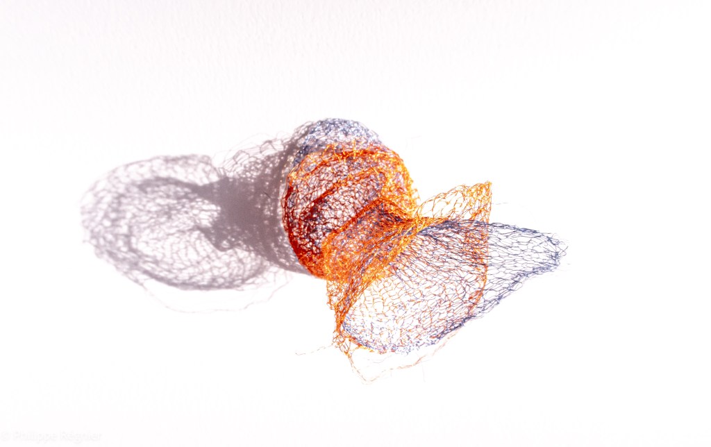 Que représente Microorganisme 2054, série ouverte débutée pour le concours international 2025 « Tisser le futur » des mini-textiles du Musée de la tapisserie contemporaine d’Angers? A l’origine de la Vie, les micro-organismes sont aussi les gardiens de notre futur. La technique intuitive que j’ai développée convoque, par analogie, plusieurs facettes des micro-organismes : petites dimensions, extrême légèreté, oeuvre en un fil et transparence. Cette dernière qualité offre une variété infinie d’ombres portées, métaphore pour célébrer leur incroyable potentiel.