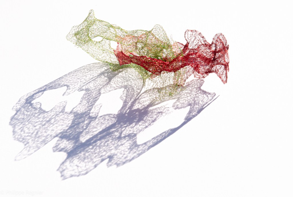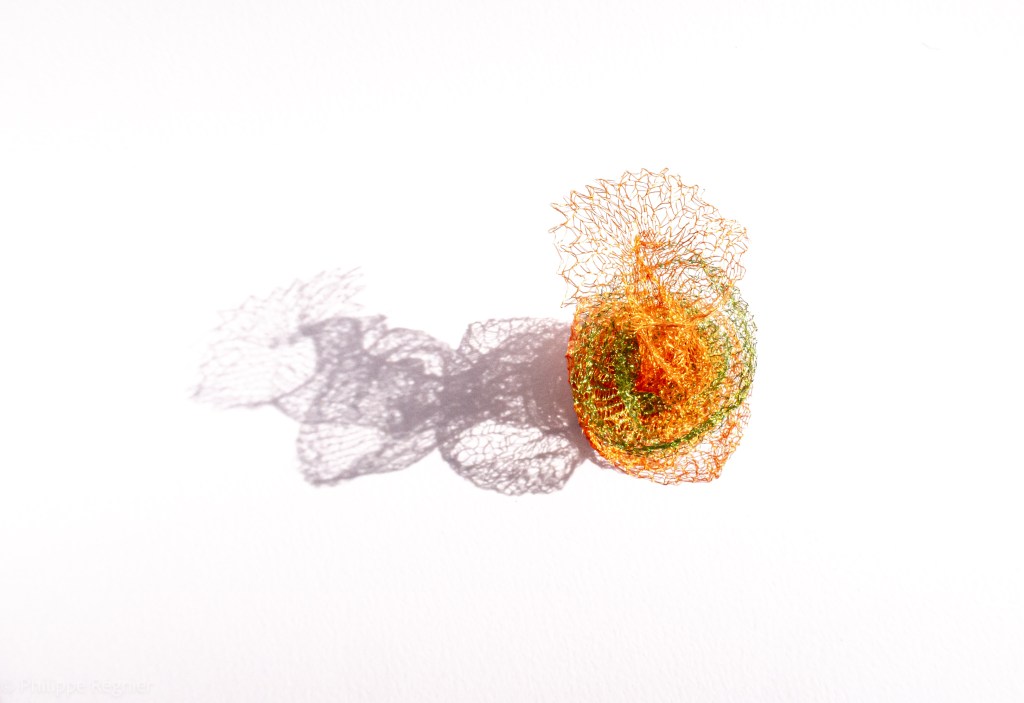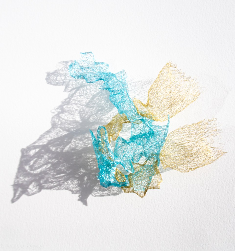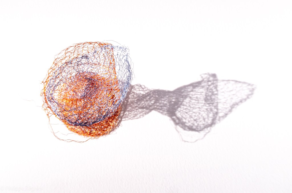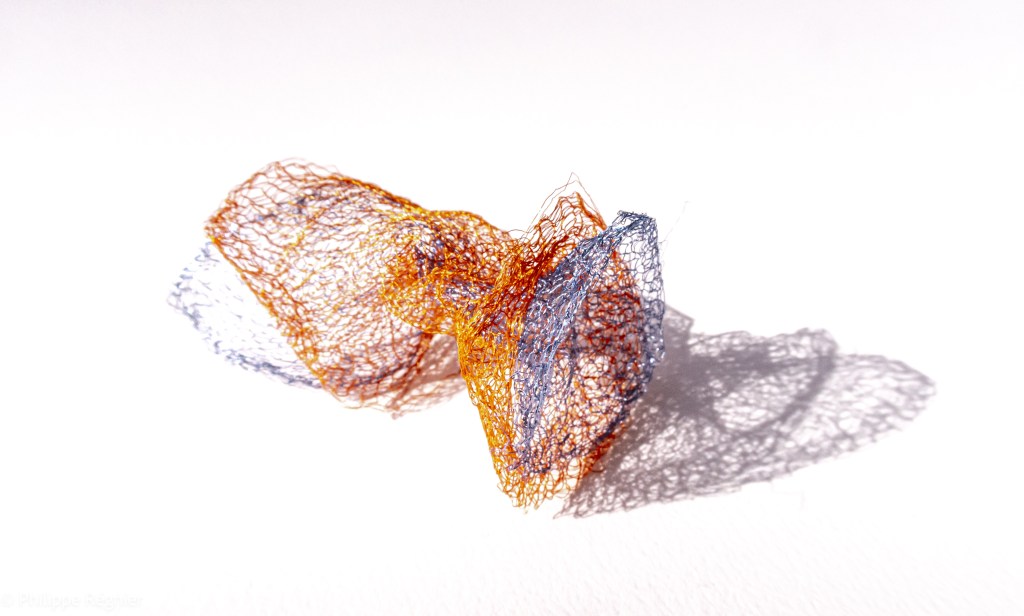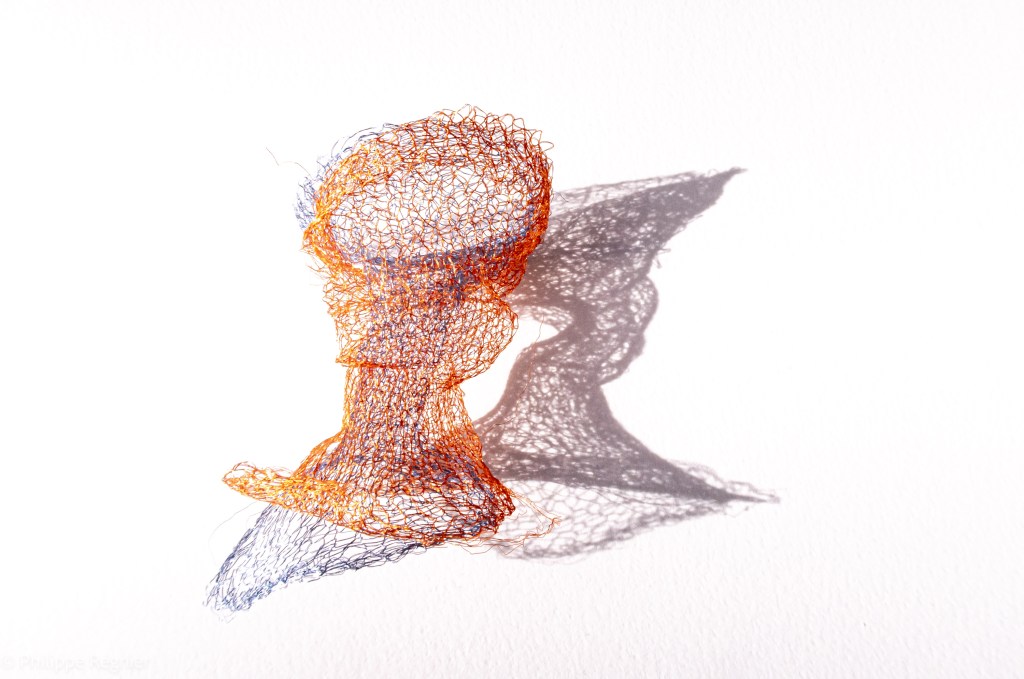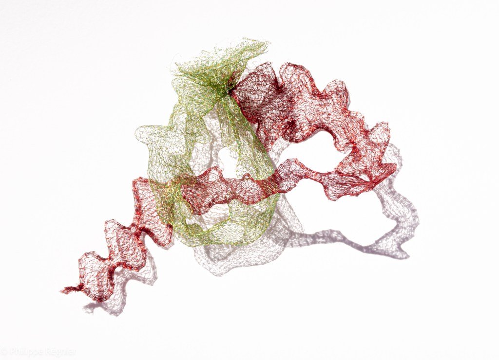 Que représente Microorganisme 2054, série ouverte débutée pour le concours international 2025 « Tisser le futur » des mini-textiles du Musée de la tapisserie contemporaine d’Angers? A l’origine de la Vie, les micro-organismes sont aussi les gardiens de notre futur. La technique intuitive que j’ai développée convoque, par analogie, plusieurs facettes des micro-organismes : petites dimensions, extrême légèreté, oeuvre en un fil et transparence. Cette dernière qualité offre une variété infinie d’ombres portées, métaphore pour célébrer leur incroyable potentiel.