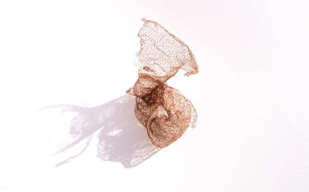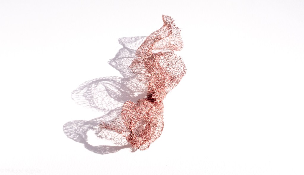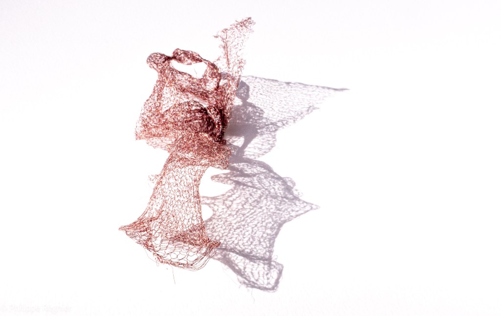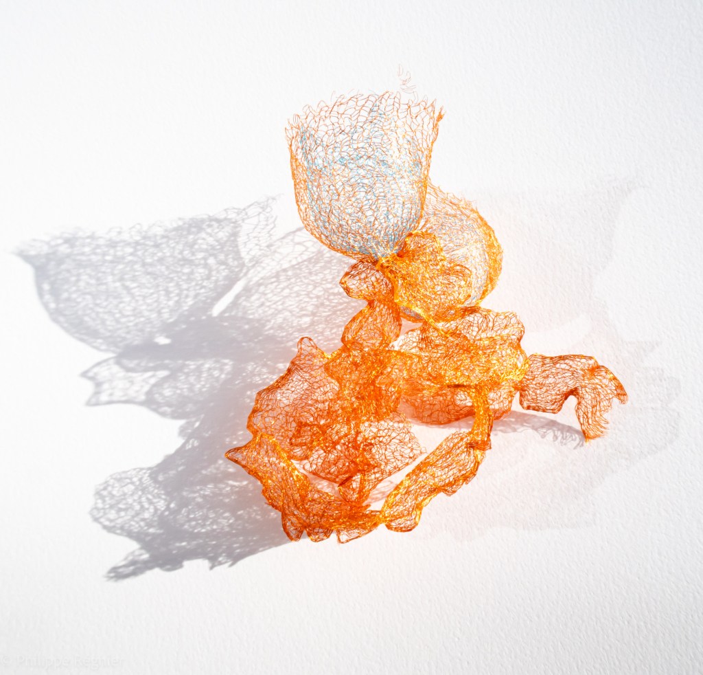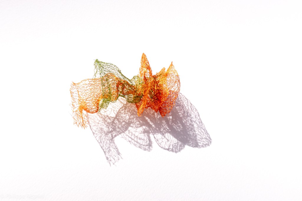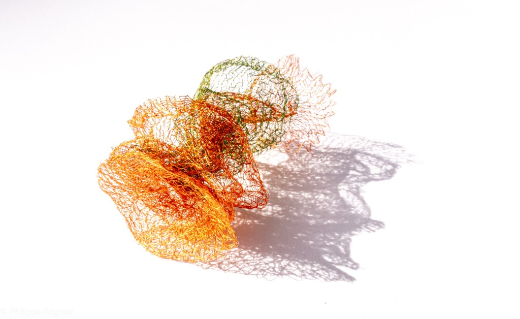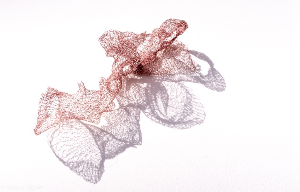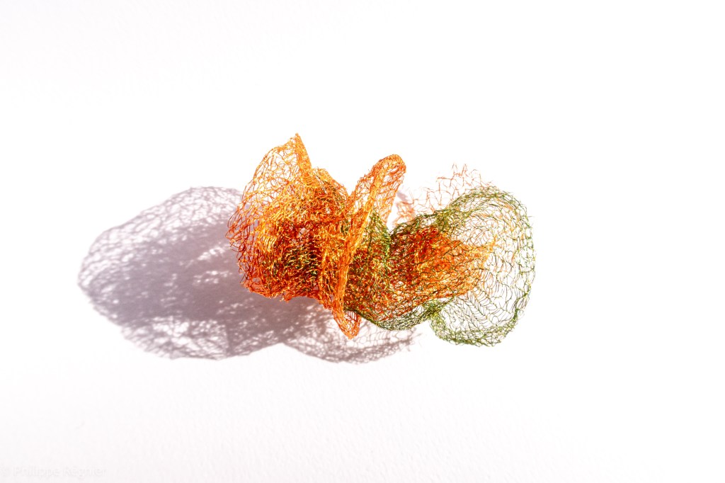 Que représente Microorganisme 2054, série ouverte débutée pour le concours international 2025 « Tisser le futur » des mini-textiles du Musée de la tapisserie contemporaine d’Angers? A l’origine de la Vie, les micro-organismes sont aussi les gardiens de notre futur. La technique intuitive que j’ai développée convoque, par analogie, plusieurs facettes des micro-organismes : petites dimensions, extrême légèreté, oeuvre en un fil et transparence. Cette dernière qualité offre une variété infinie d’ombres portées, métaphore pour célébrer leur incroyable potentiel.