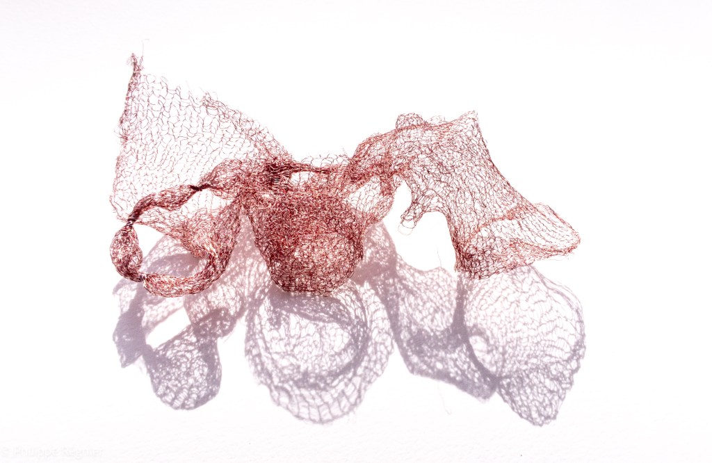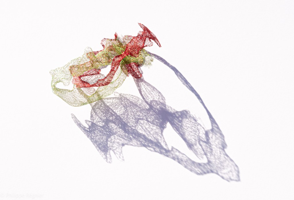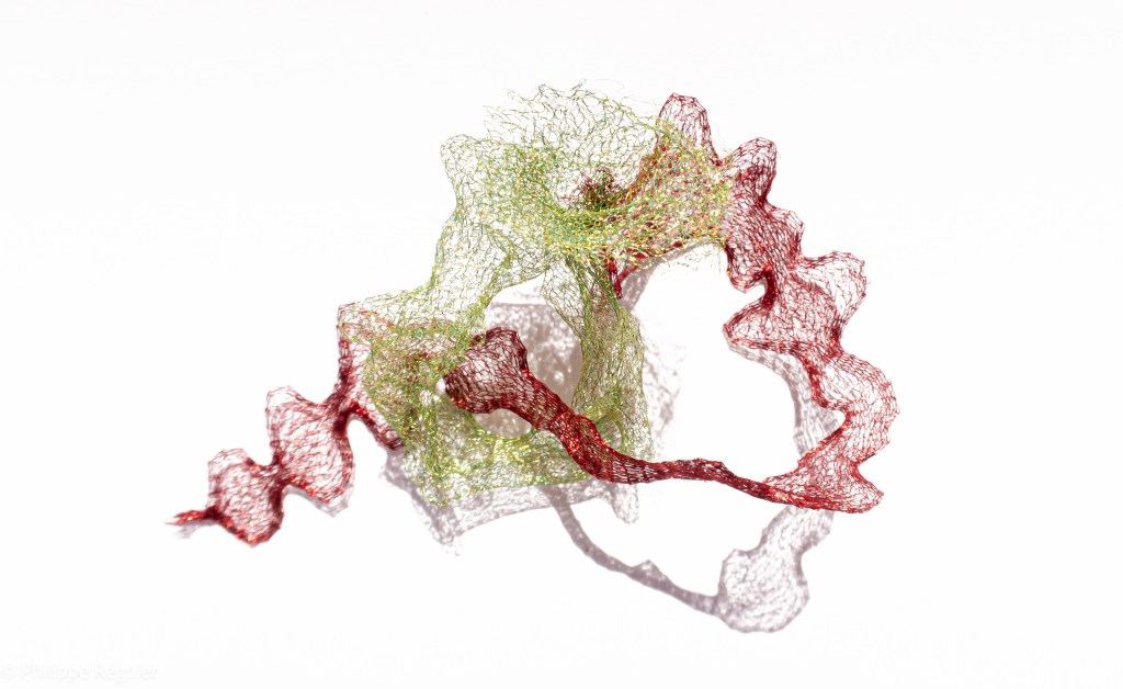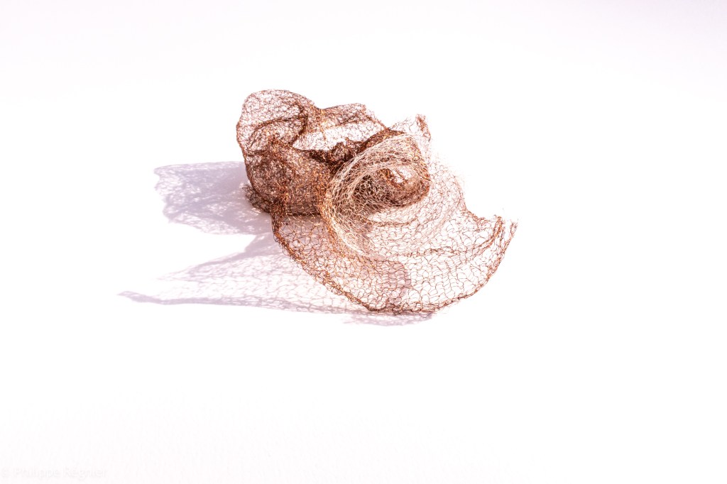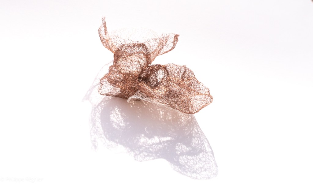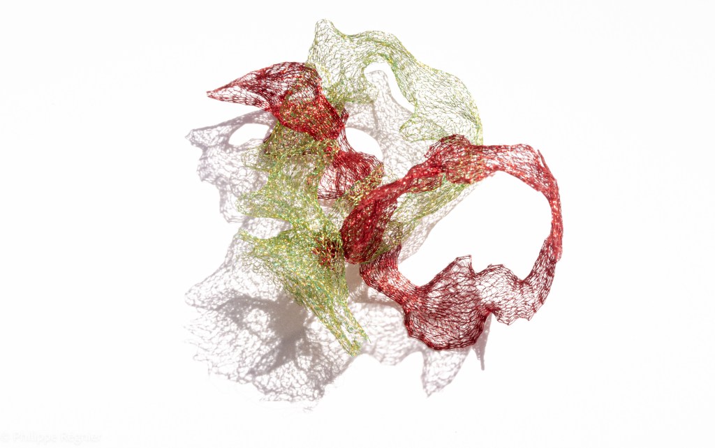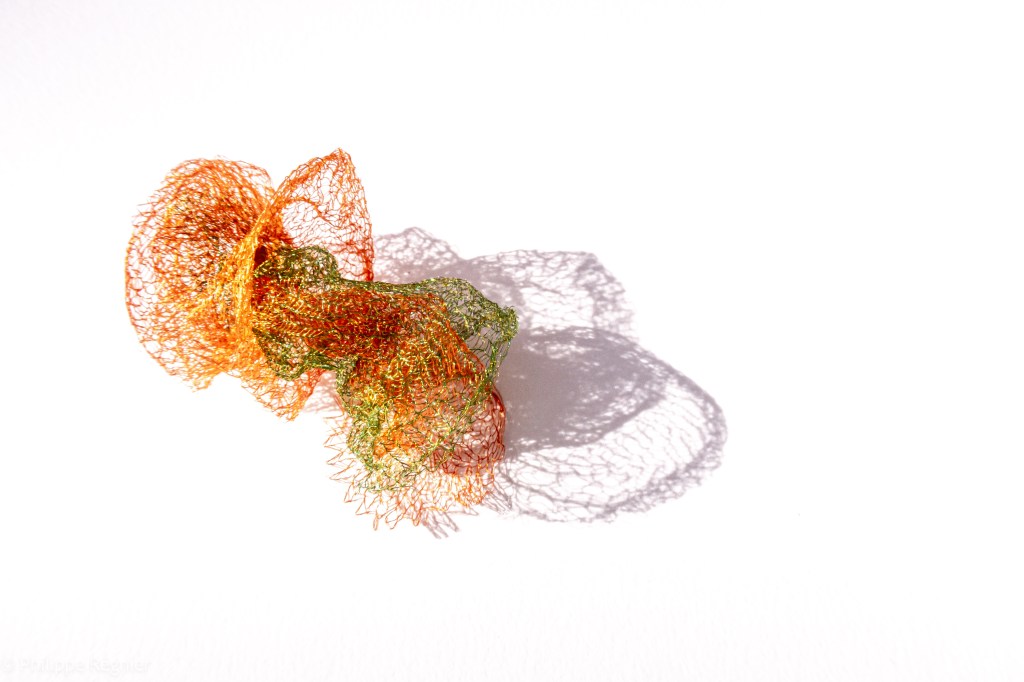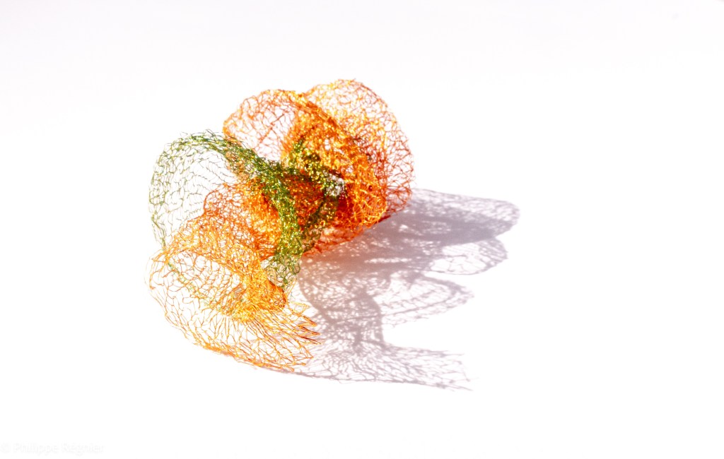 Que représente Microorganisme 2054, série ouverte débutée pour le concours international 2025 « Tisser le futur » des mini-textiles du Musée de la tapisserie contemporaine d’Angers? A l’origine de la Vie, les micro-organismes sont aussi les gardiens de notre futur. La technique intuitive que j’ai développée convoque, par analogie, plusieurs facettes des micro-organismes : petites dimensions, extrême légèreté, oeuvre en un fil et transparence. Cette dernière qualité offre une variété infinie d’ombres portées, métaphore pour célébrer leur incroyable potentiel.