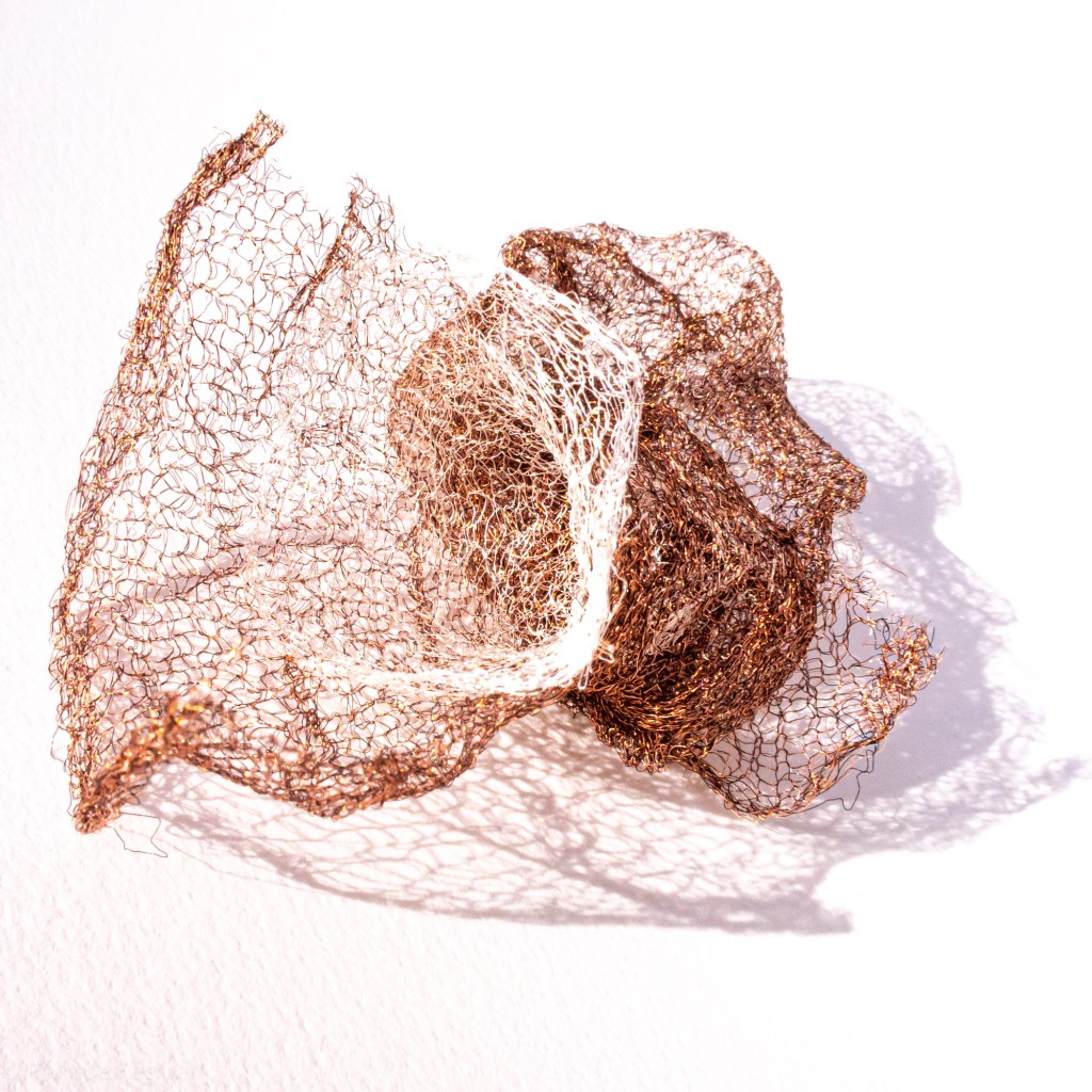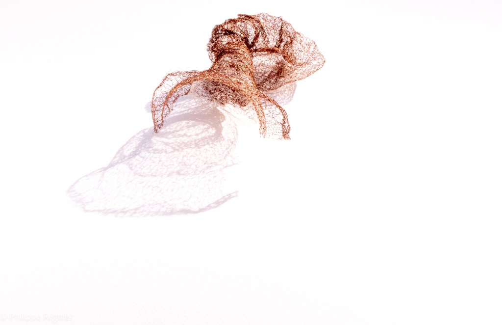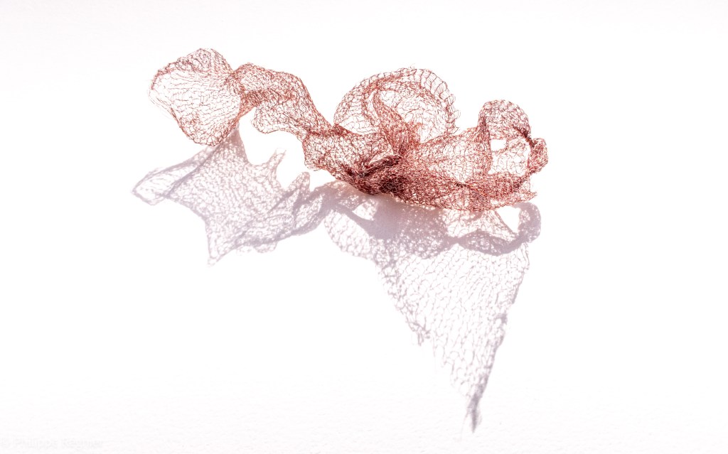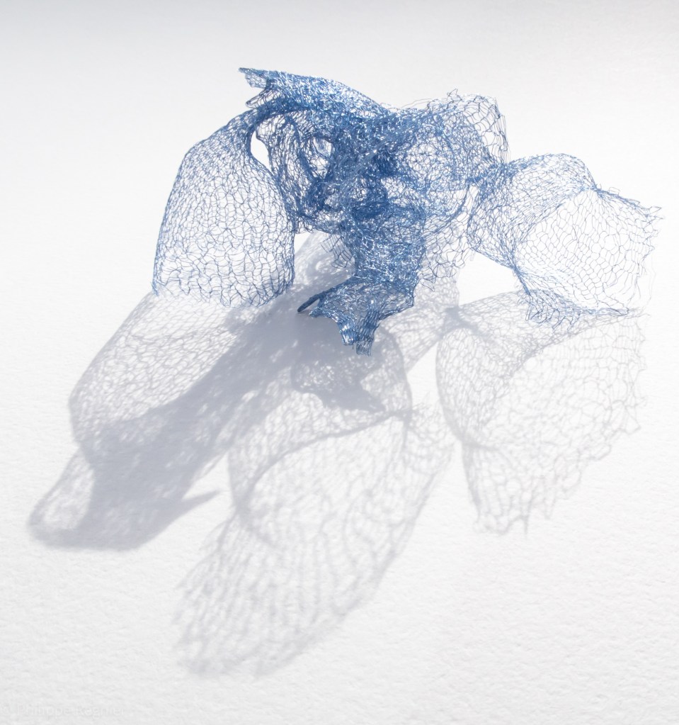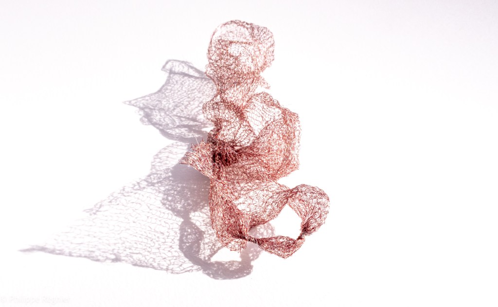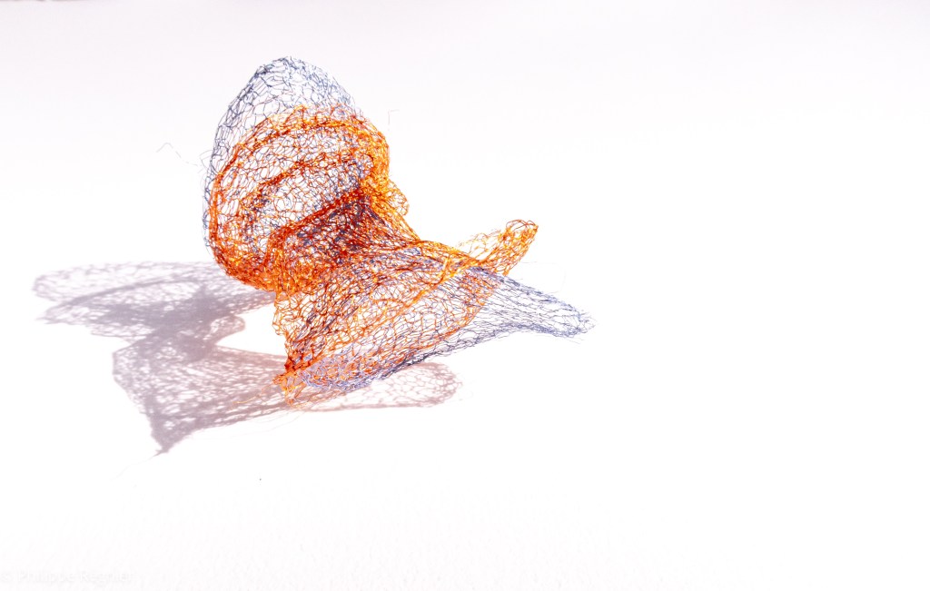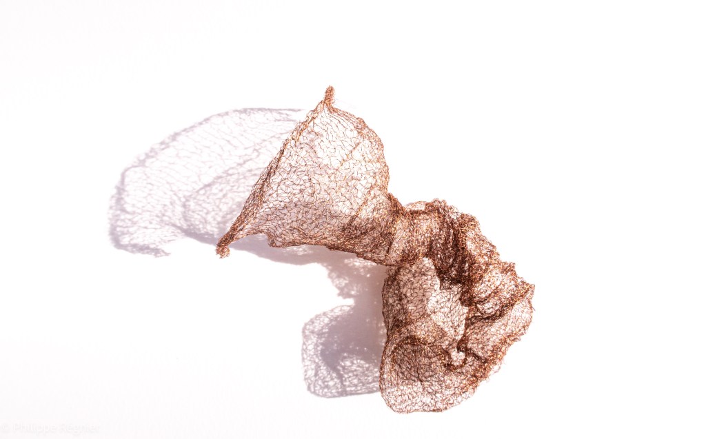 Que représente Microorganisme 2054, série ouverte débutée pour le concours international 2025 « Tisser le futur » des mini-textiles du Musée de la tapisserie contemporaine d’Angers? A l’origine de la Vie, les micro-organismes sont aussi les gardiens de notre futur. La technique intuitive que j’ai développée convoque, par analogie, plusieurs facettes des micro-organismes : petites dimensions, extrême légèreté, oeuvre en un fil et transparence. Cette dernière qualité offre une variété infinie d’ombres portées, métaphore pour célébrer leur incroyable potentiel.